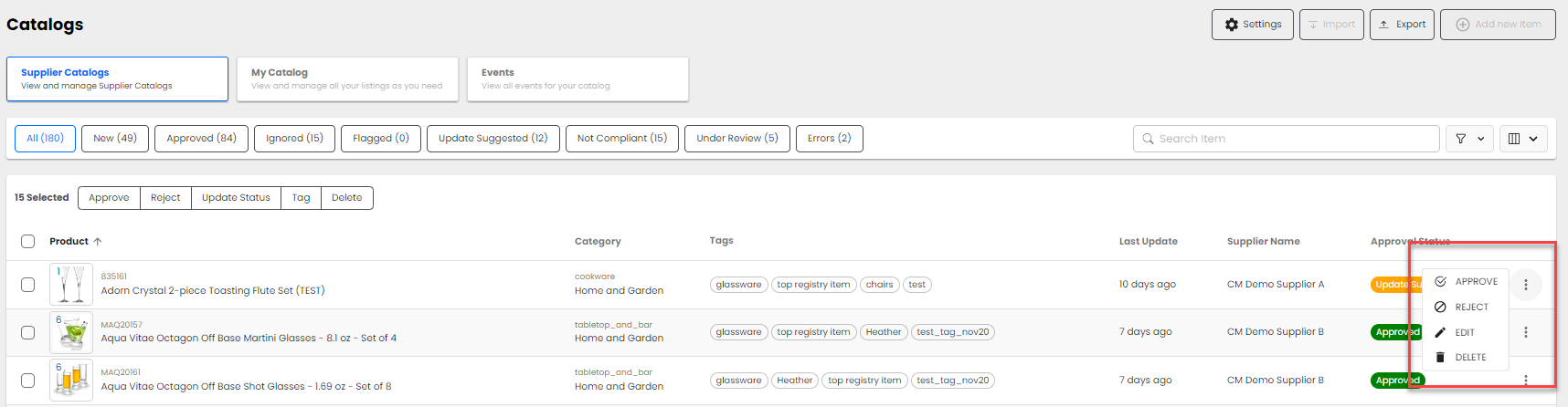 Reject - Bulk-rejecting products will send the selected products back to the supplier for review. When rejecting, you have the ability to provide a rejection note.