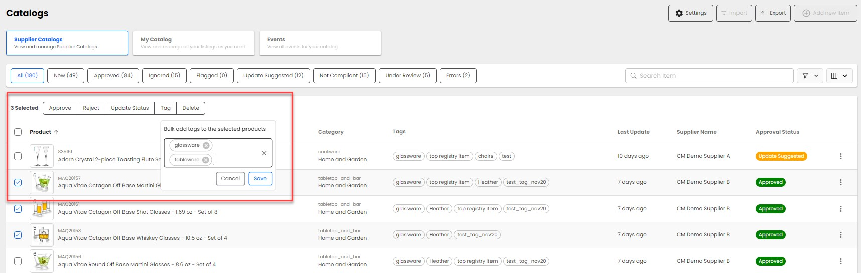 Tag – Bulk tagging products provide the ability to apply the same customizable filters to several products within the catalog. Tags can be used to segment products by merchant, season, top sellers, etc.