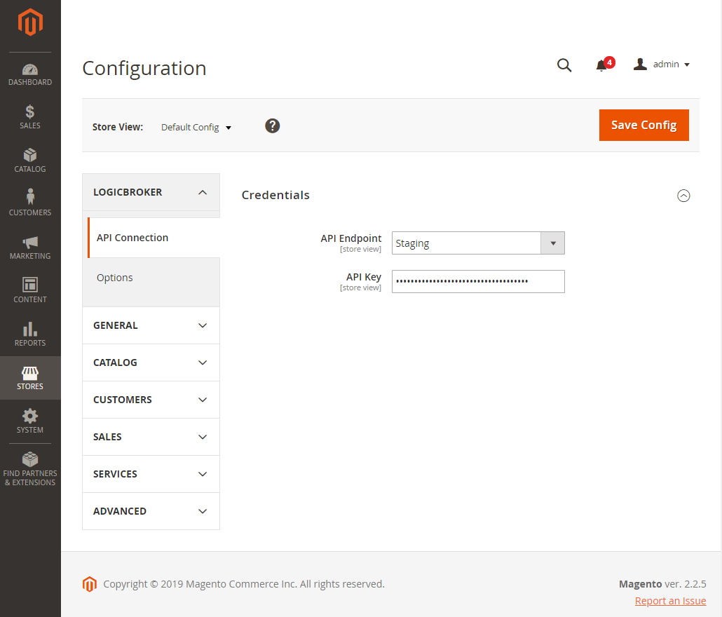Now that you have the Logicbroker extension installed, you need to configure it with your Logicbroker API key before it can communicate with the Logicbroker system. This API key can be generated and found in the Logicbroker Portal under Settings -> API Authentication.