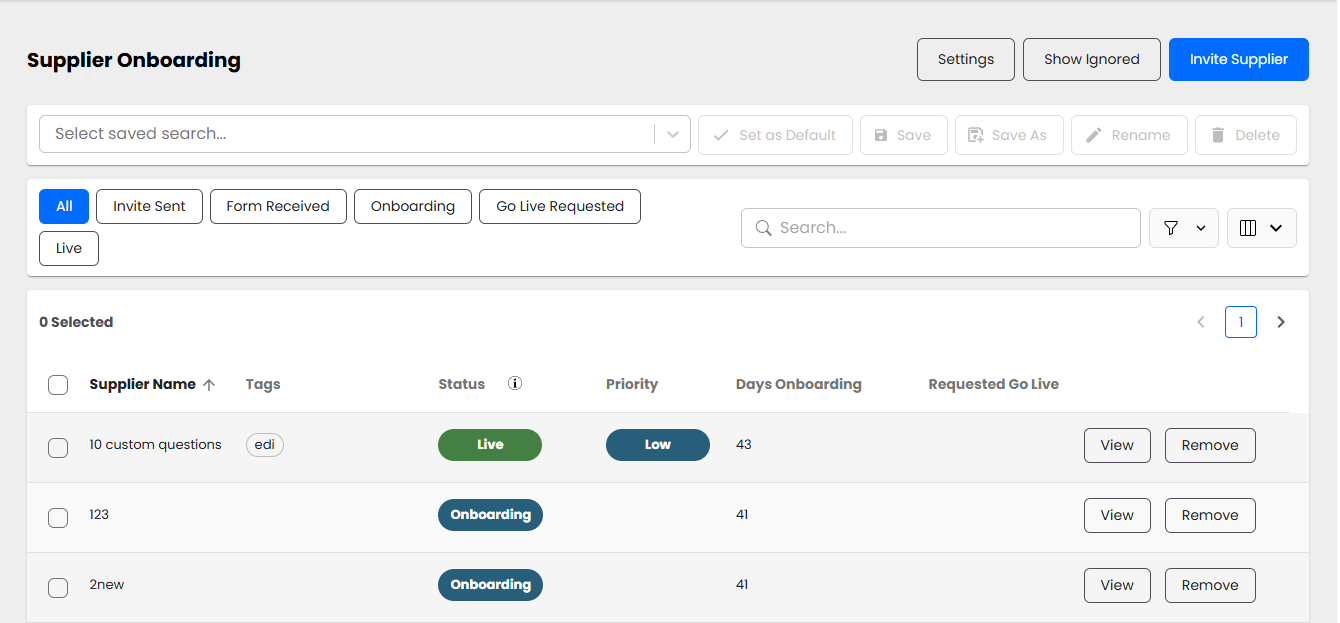 All Onboarding pages have new styling applied to provide a seamless and consistent experience. The main onboarding page features new quick filters and new functionality to use the Saved Search functionality. Now users can set up supplier groups and apply filers on this page to see relevant data. The Supplier Onboarding page now organizes form details in sections to easily navigate.