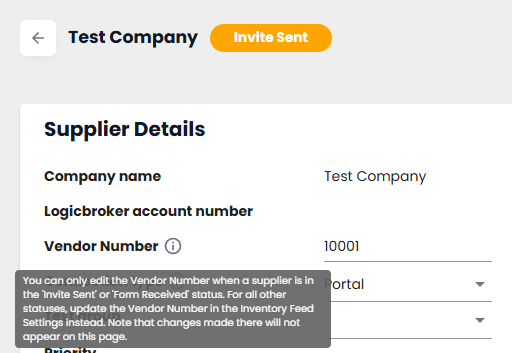 - Vendor numbers can be edited from the individual supplier page only when the supplier is in an 'Invite Sent' and 'Form Received' status (once a supplier goes into an 'Onboarding' status, their account is created in stage and this field cannot be edited)